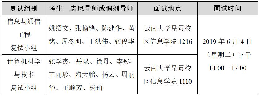 计算机科学与技术复试小组:岳昆(组长、博导)、张学杰(博导)、李彤(博导)、徐丹(博导)、王丽珍(博导)、陶大鹏(博导)、杨云(博导)、周丽华(博导)、王顺芳(博导)、杨珀(博导)。