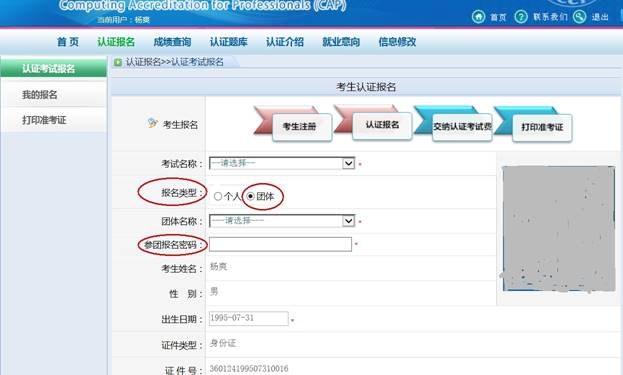 (2)报名(请注意:在”个人注册报名“中报名)。如下图所示,进入“认证报名”——》“认证考试报名”,在报名类型一项选择“团体”,并选择相应的团体名称(公司名称),将参团密码填写在“参团报名密码”一项中即可享受团体报名资格。(参见下图)